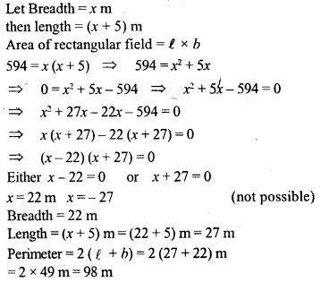 The length of a rectangular hall is 5 m more than its breadth, If the area of the hall is 594 m2, find its perimeter.