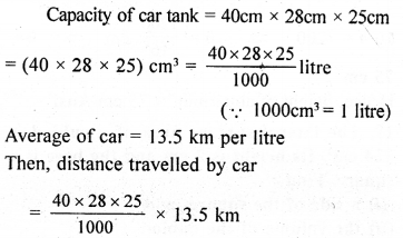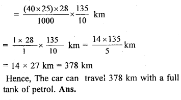 A car has a petrol tank 40 cm long, 28 cm wide and 25 cm deep. If the fuel consumption of the car averages 13.5 km per litre, how far can the car travel with a full tank of petrol ?