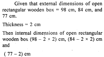 The external dimensions of an open rectangular wooden box are 98 cm by 84 cm by 77 cm. If the wood is 2 cm thick all around, find :