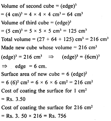 Three cubes of silver with edges 3 cm, 4 cm and 5 cm are melted and recast into a single cube. Find the cost of coating the surface of the new cube with gold at the rate of Rs. 3.50 per square centimetre.