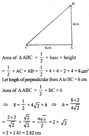 ABC is a triangle in which AB = AC = 4 cm and ∠ A = 90°. Calculate the area of ∆ABC. Also find the length of perpendicular from A to BC.