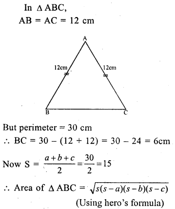 Find the area of an isosceles triangle whose equal sides are 12 cm each and the perimeter is 30 cm.