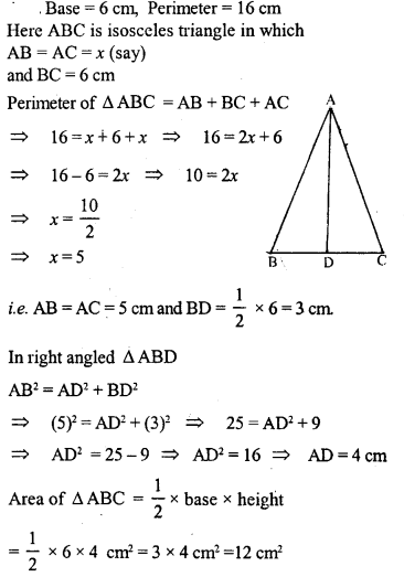 Find the area of an isosceles triangle whose base is 6 cm and perimeter is 16 cm.