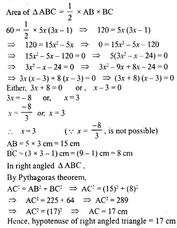 The sides of a right angled triangle containing the right angle are 5x cm and (3x – 1) cm. Calculate the length of the hypotenuse of the triangle if its area is 60 cm².