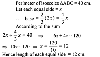 The perimeter of an isosceles triangle is 40 cm. The base is two third of the sum of equal sides. Find the length of each side.