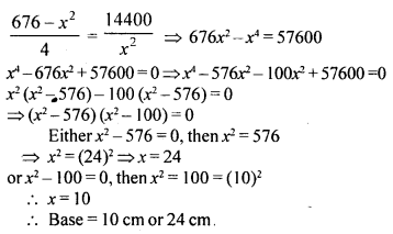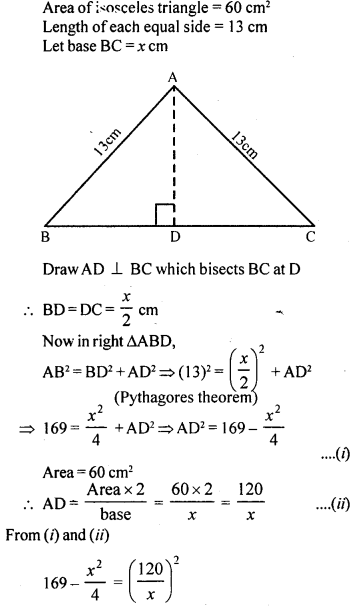 If the area of an isosceles triangle is 60 cm2 and the length of each of its equal sides is 13 cm, find its base.