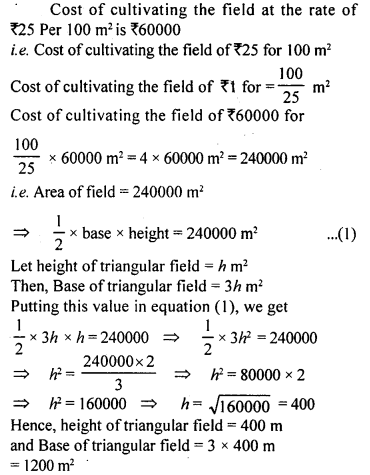 The base of a triangular field is 3 times its height If the cost of cultivating the field at the rate of ₹25 per 100m2 is ₹60000, find its base and height.