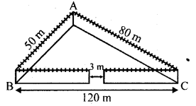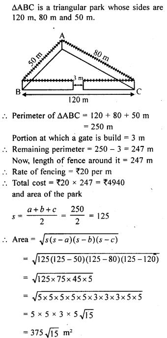 A triangular park ABC? has sides 120 m, 80 m and 50 m (as shown in the given figure). A gardner Dhania has to put a fence around it and also plant grass inside. How much area does she need to plant? Find the cost of fencing it with barbed wire at the rate of ₹20 per metre leaving a space 3 m wide for a gate on one side.