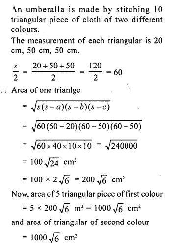 An umbrella is made by stitching 10 triangular pieces of cloth of two different colours (shown in the given figure), each piece measuring 20 cm, 50 cm and 50 cm. How much cloth of each colour is required for the umbrella?