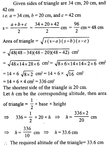 Find the area of a triangle whose sides are 34 cm, 20 cm and 42 cm. Hence, find the length of the altitude corresponding to the shortest side.