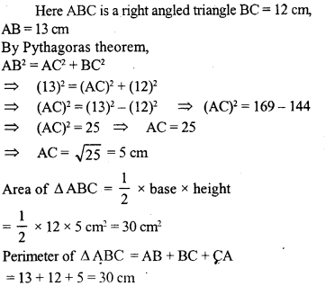 The base of a right angled triangle is 12 cm and its hypotenuse is 13 cm long. Find its area and the perimeter.