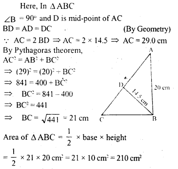In ∆ ABC, ∠B = 90° and D is mid-point of AC. If AB = 20 cm and BD = 14.5 cm, find the area and the perimeter of ∆ ABC.