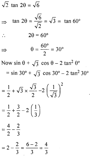 If \( \sqrt2 \) tan 2 θ = \( \sqrt6 \) and θ° < 2θ < 90°, find the value of sin θ + \( \sqrt3 \) cos θ – 2 tan2 θ.