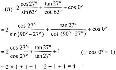 (ii) \(2 \frac{\cos 27^{\circ}}{\sin 63^{\circ}}+\frac{\tan 27^{\circ}}{\cot 63^{\circ}}+\cos 0^{\circ}\)