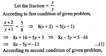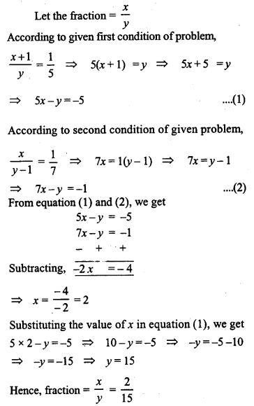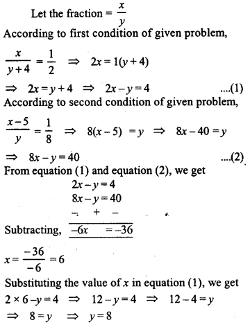 Find the fraction which becomes \(\frac { 1 }{ 2 }\) when the denominator is increased by 4 and is equal to \(\frac { 1 }{ 8 }\) , when the numerator is diminished by 5.