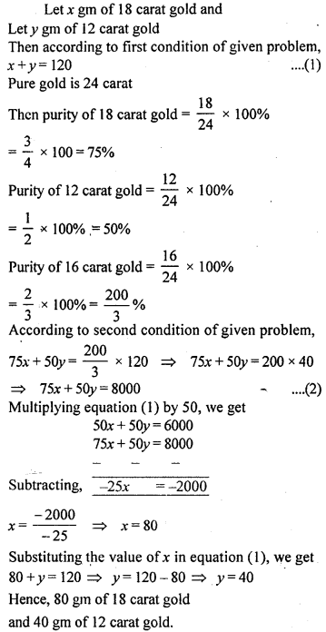 A jeweller has bars of 18-carat gold and 12- carat gold. How much of each must be melted together to obtain a bar of 16-carat gold weighing 120 grams ? (Pure gold is 24 carat)