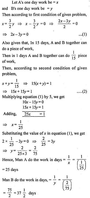 A and B together can do a piece of work in 15 days. If A’s one day work is 1 \(\frac { 1 }{ 2 }\) times the one day’s work of B, find in how many days can each do the work.