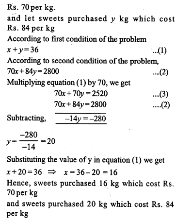 The class IX students of a certain public school wanted to give a farewell party to the outgoing students of class X. They decided to purchase two kinds of sweets, one costing Rs. 70 per kg and the other costing Rs. 84 per kg. They estimated that 36 kg of sweets were needed. If the total money spent on sweets was Rs. 2800, find how much sweets of each kind they purchased.