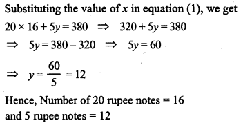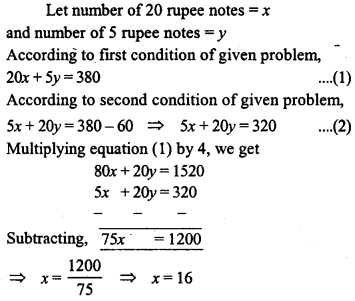 A man has certain notes of denominations Rs. 20 and Rs. 5 which amount to Rs. 380. If the number of notes of each kind is interchanged, they amount to Rs. 60 less as before. Find the number of notes of each denomination.