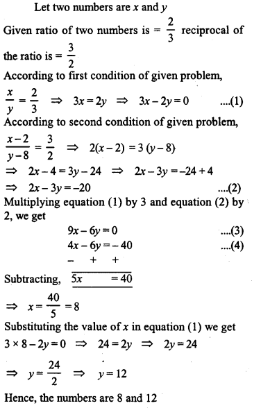 The ratio of two numbers is \(\frac { 2 }{ 3 }\). If 2 is subtracted from the first and 8 from the second, the ratio becomes the reciprocal of the original ratio. Find the numbers.