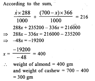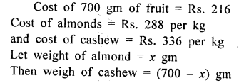 A 700 gm dry fruit packcosts Rs. 216. It contains some almonds and the rest cashew kernel. If almonds cost Rs. 288 ‘per kg and cashew kernel.cost Rs. 336 per kg, what are the quantities of the two dry fruits separately ?