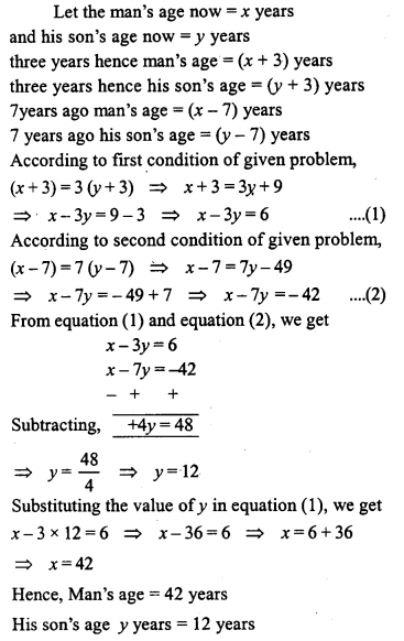 Three years hence a man’s age will be three times his son’s age and 7 years ago he was seven times as old as his son. How old are they now ?