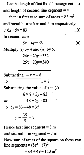 Rectangles are drawn on line segments of fixed lengths. When the breadths are 6 m and 5 m respectively the sum of the areas of the rectangles is 83 m². But if the breadths are 5 m and 4 m respectively the sum of the areas is 68 m². Find the sum of the areas of the squares drawn on the line segments.
