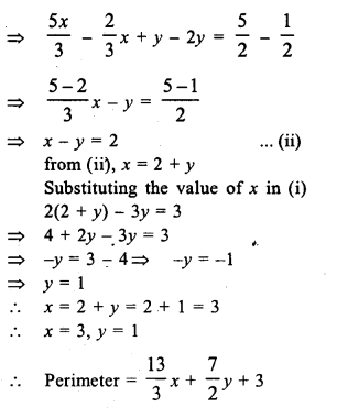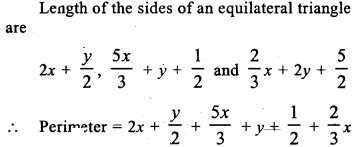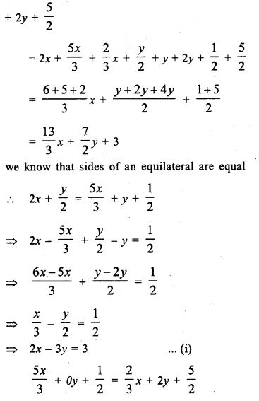 The lenghts (in metres) of the sides of a triangle are 2x + \(\frac { y }{ 2 }\), \(\frac { 5x }{ 3 }\) + y + \(\frac { 1 }{ 2 }\) and \(\frac { 2 }{ 3 }\)x + 2y + \(\frac { 5 }{ 2 }\). If the triangle is equilateral, find its perimeter.