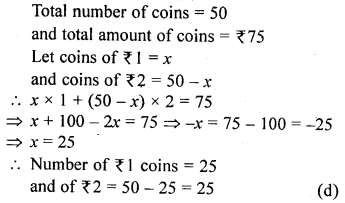 Aruna has only ₹1 and ₹2 coins with her. If the total number of coins that she has is 50 and the amount of the money with her is ₹75, then the number of ₹1 and ₹2 coins are, respectively