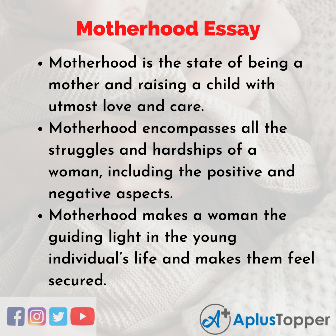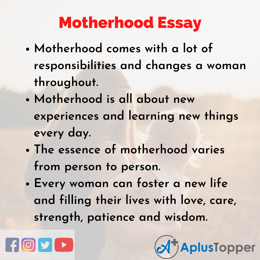 We are providing students with essay samples on a long essay of 500 words and a short essay of 150 words on the topic Motherhood for reference.