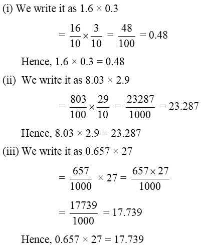 1. Multiply : (i) 1.6 by 0.3 (ii) 8.03 by 2.9 (iii) 0.657 by 27