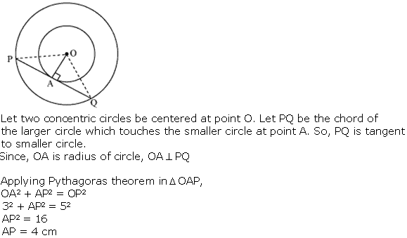 Concept Insight: Here, PQ is a chord of the larger circle and it touches the smaller circle at a point. So, it will act as a tangent to the smaller circle, Then, by applying the result that the radius is perpendicular to the tangent at the point of contact, a right traingle will be obtained in which Pythagoras theorem will be applied. Then, to find the length of the chord PQ, a result can be used, which states that, perpendicular drawn from center of a circle bisects the chord.