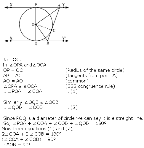 Question 9. In Fig. 10.13, XY and X′Y′ are two parallel tangents to a circle with centre O and another tangent AB with point of contact C intersecting XY at A and X′Y′ at B. Prove that ∠ AOB = 90°.