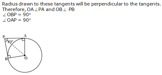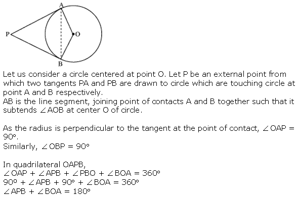 Hence, the angle between the two tangents drawn from an external point to a circle is supplementary to the angle subtended by the line-segment joining the points of contact at the centre.