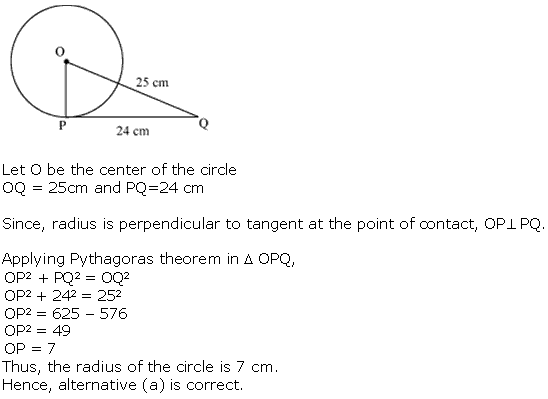 Question 1. From a point Q, the length of the tangent to a circle is 24 cm and the distance of Q from the centre is 25 cm. The radius of the circle is