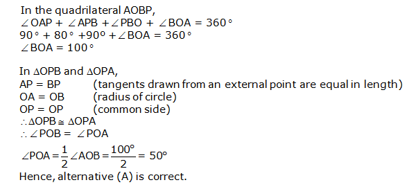 Question 3. If tangents PA and PB from a point P to a circle with centre O are inclined to each other at angle of 80°, then ∠ POA is equal to (A) 50° (B) 60° (C) 70° (D) 80°