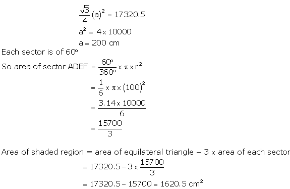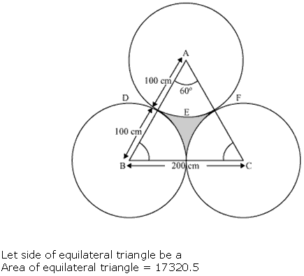 The area of an equilateral triangle ABC is 17320.5 cm2. With each vertex of the triangle as centre, a circle is drawn with radius equal to half the length of the side of the triangle (see Fig. 12.28). Find the area of the shaded region. (Use π = 3.14 and √3 = 1.73205)