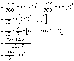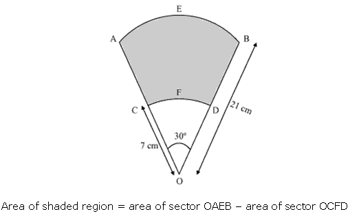 AB and CD are respectively arcs of two concentric circles of radii 21 cm and 7 cm and centre O (see Fig. 12.32). If ∠AOB = 30°, find the area of the shaded region.