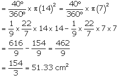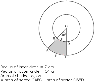 Find the area of the shaded region in Fig. 12.20, if radii of the two concentric circles with centre O are 7 cm and 14 cm respectively and ∠AOC = 40°.