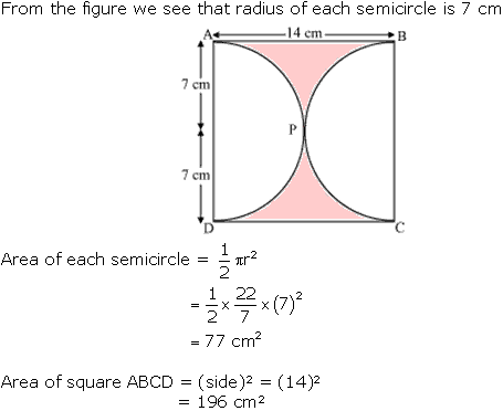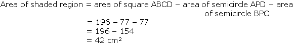 Find the area of the shaded region in Fig. 12.21, if ABCD is a square of side 14 cm and APD and BPC are semicircles.