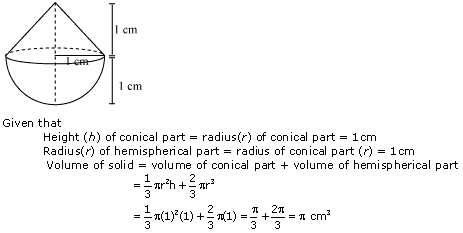 A solid is in the shape of a cone standing on a hemisphere with both their radii being equal to 1 cm and the height of the cone is equal to its radius. Find the volume of the solid in terms of π.
