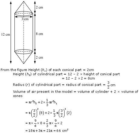 Rachel, an engineering student, was asked to make a model shaped like a cylinder with two cones attached at its two ends by using a thin aluminium sheet. The diameter of the model is 3 cm and its length is 12 cm. If each cone has a height of 2 cm, find the volume of air contained in the model that Rachel made. (Assume the outer and inner dimensions of the model to be nearly the same.)
