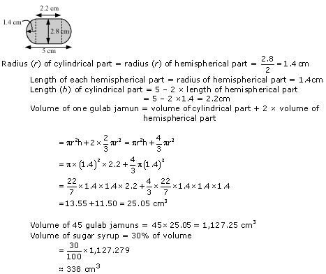 A gulab jamun, contains sugar syrup up to about 30% of its volume. Find approximately how much syrup would be found in 45 gulab jamuns, each shaped like a cylinder with two hemispherical ends with length 5 cm and diameter 2.8 cm.