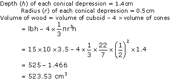 A pen stand made of wood is in the shape of a cuboid with four conical depressions to hold pens. The dimensions of the cuboid are 15 cm by 10 cm by 3.5 cm. The radius of each of the depressions is 0.5 cm and the depth is 1.4 cm. Find the volume of wood in the entire stand.