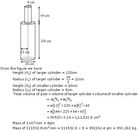 A solid iron pole consists of a cylinder of height 220 cm and base diameter 24 cm, which is surmounted by another cylinder of height 60 cm and radius 8 cm. Find the mass of the pole, given that 1 cm3 of iron has approximately 8g mass.