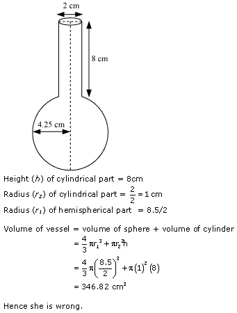 A spherical glass vessel has a cylindrical neck 8 cm long, 2 cm in diameter; the diameter of the spherical part is 8.5 cm. By measuring the amount of water it holds, a child finds its volume to be 345 cm3. Check whether she is correct, taking the above as the inside measurements, and π = 3.14.