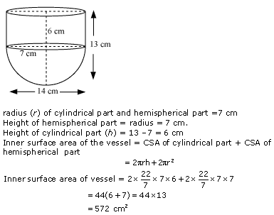 A vessel is in the form of a hollow hemisphere mounted by a hollow cylinder. The diameter of the hemisphere is 14 cm and the total height of the vessel is 13 cm. Find the inner surface area of the vessel.