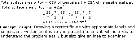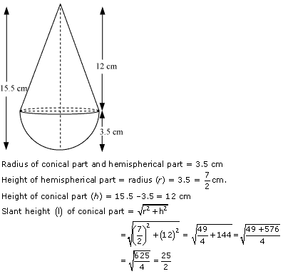 A toy is in the form of a cone of radius 3.5 cm mounted on a hemisphere of same radius. The total height of the toy is 15.5 cm. Find the total surface area of the toy.