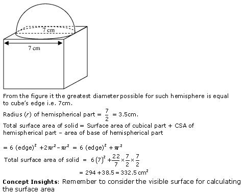 A cubical block of side 7 cm is surmounted by a hemisphere. What is the greatest diameter the hemisphere can have? Find the surface area of the solid.