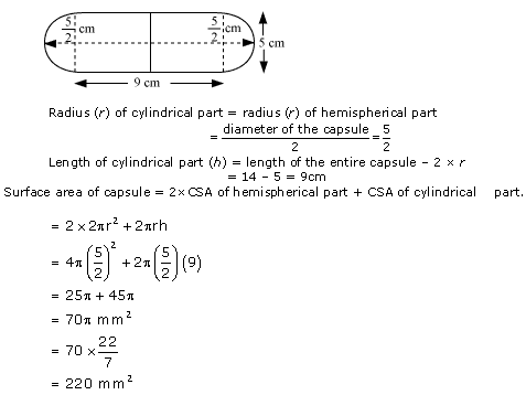 A medicine capsule is in the shape of a cylinder with two hemispheres stuck to each of its ends. The length of the entire capsule is 14 mm and the diameter of the capsule is 5 mm. Find its surface area.